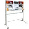 In the central part of the stand on the right is the car’s mounting block. The front panel contains introductory circuit breakers, measuring instruments (voltmeter, ammeter), toggle switches that simulate the operation of the sensors of the vehicle alarm system. On the rear panel of the stand there is a block for input of faults and an electric circuit of the car lighting system is shown.