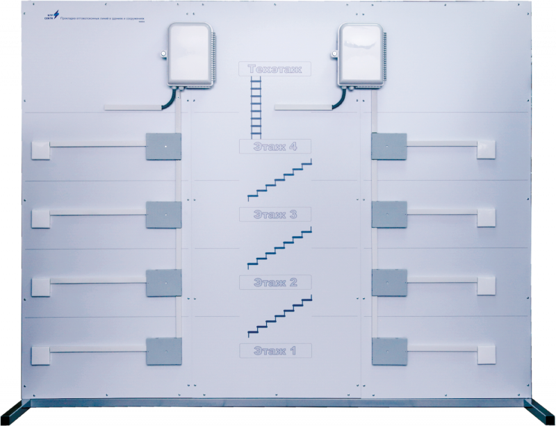 NTC-03.11 “Construction of indoor fiber-optic communication lines” The training laboratory equipment is dedicated for getting practical skills of fiber optic lines laying and mounting switch boxes at 4 floors in the building.
